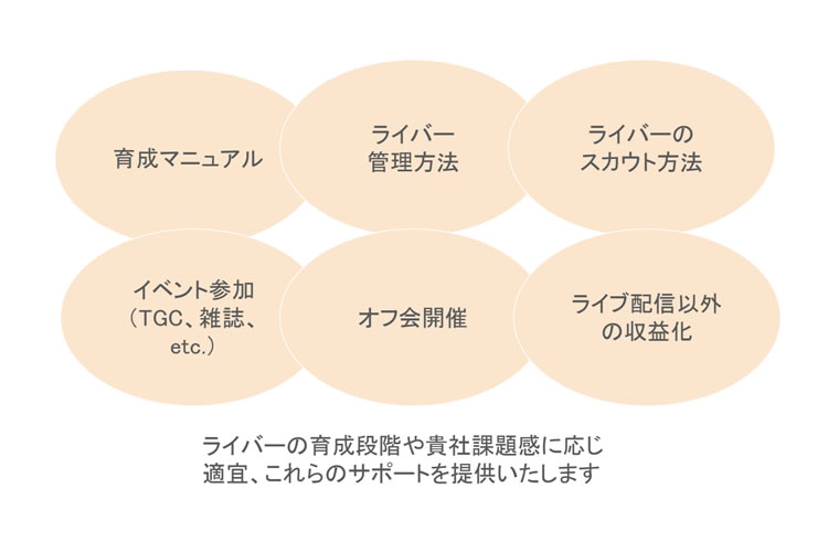| 支援内容 | ・育成マニュアル ・ライバー管理方法 ・ライバースカウト方法 ・イベント参加 ・オフ会開催 ・ライブ配信以外の収益化 |