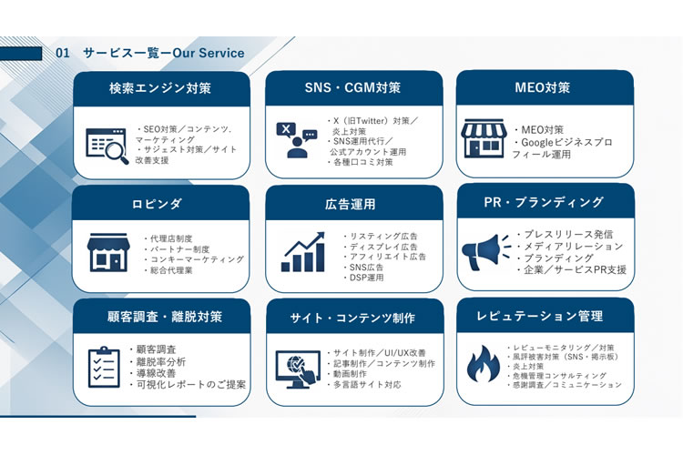 | サービス一覧 | 検索エンジン対策/SNS・CGM対策/MEO対策/ロピンダ/広告費用/PR・ブランディング/顧客調査・離脱対策/サイト・コンテンツ制作/レピュテーション管理/ |