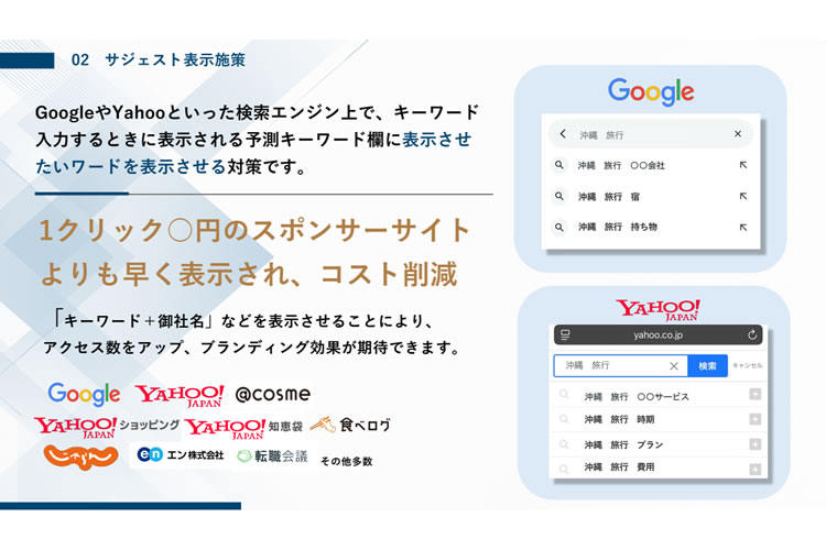 | 特長 | 検索サジェストに企業名やサービス関連ワードを表示させることで、検索行動の入り口からユーザーの関心を獲得できるマーケティング施策です。 広告費に依存しない集客を実現しながら、SEOや広告など既存のWeb施策と組み合わせて提案できます。 |