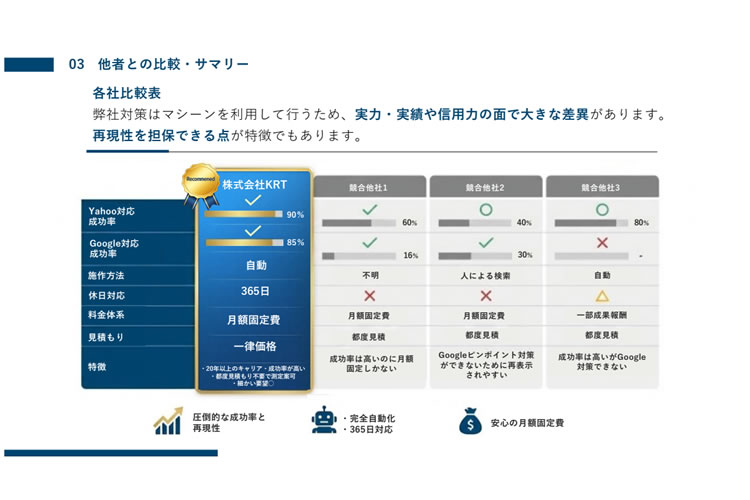 本サービスは、SEO対策、MEO対策、広告運用、Web制作など、さまざまなWebマーケティングサービスと組み合わせて提案しやすい点も大きな特徴です。