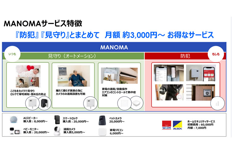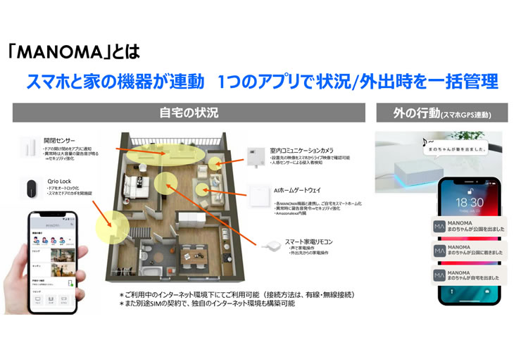 「MANOMA」は、防犯・見守り・家電操作をひとつのアプリでまとめて管理できるスマートホームサービスです。専用アプリとIoT機器を組み合わせることで、外出先から自宅の状況を確認したり、家族や高齢者の見守り、玄関のスマートロック操作などが可能になります。