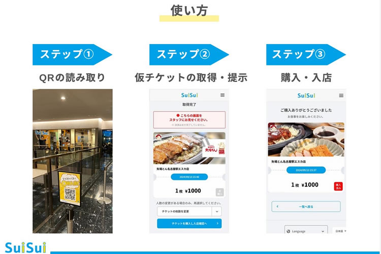 「SuiSui」は、飲食店向けに開発されたファストパス型のサービスです。来店時にチケットを購入することで、店頭での待ち時間をゼロにすることができます。ディズニーランドのファストパスのような感覚で利用できる、業界初の仕組みです。
