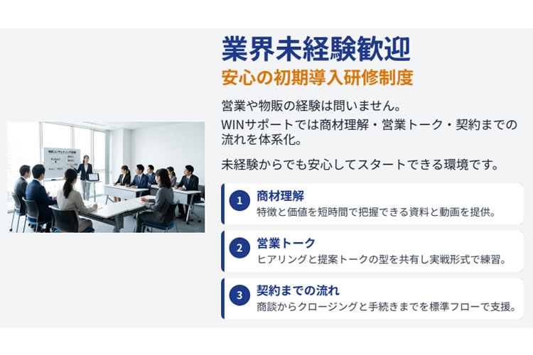 副業として限られた時間で成果を出したい方にも適しており、営業未経験者に向けた初期導入研修もご用意しています。