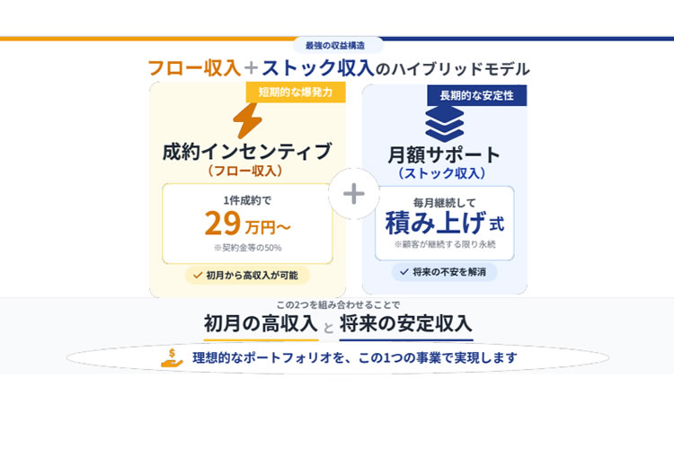 当ビジネスでは、成約時のフロー収益と月額のストック収益を組み合わせたハイブリッド型の収益構造が採用されています。この2つの収益を組み合わせることで「初月の高収入」と「将来の安定収入」の両立が可能です。