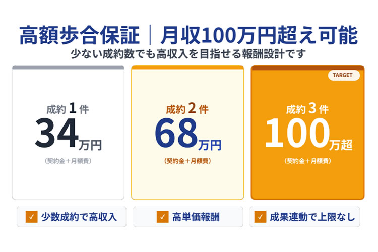 高単価の報酬設計により、少ない成約数でも大きな収益を目指せる点も魅力です。無理に多くの契約を追う必要がなく、少数の成約でも十分な収益を見込める設計となっています。営業活動の負担を抑えながら、高い収益性を確保できる点は大きなメリットです。