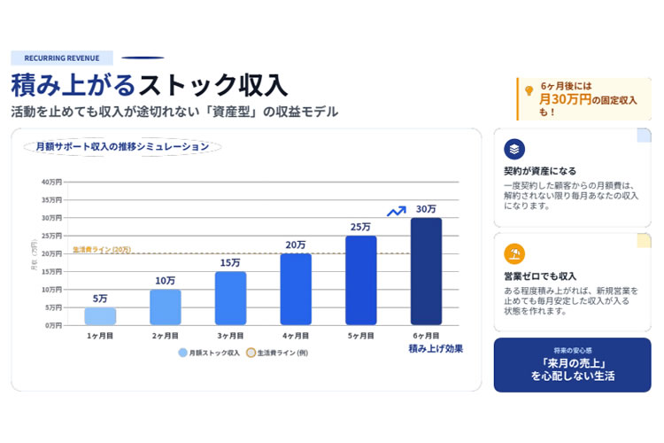 また、活動初期はフロー収益で収入を作り、契約が増えてきた段階でストック収益が安定してくるため、段階的に収益基盤を構築できる点も特徴です。