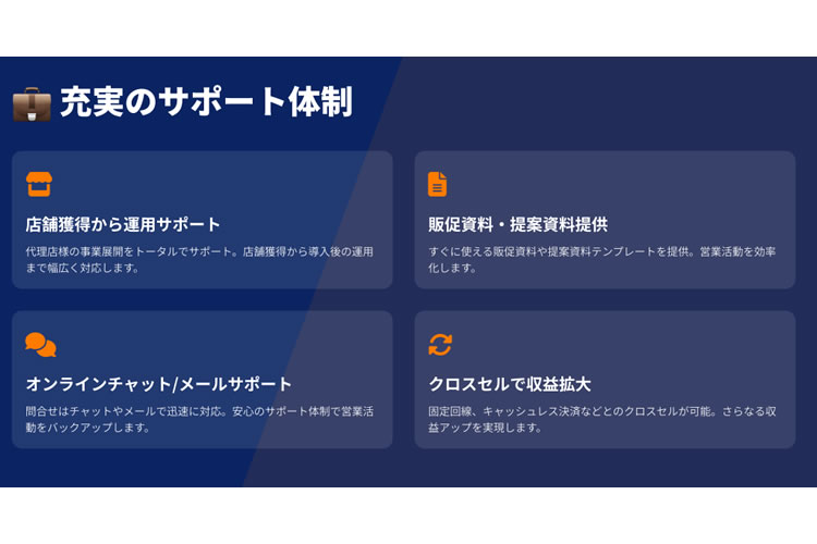 | 支援体制 | ・店舗獲得から運用サポート ・オンラインチャット/メールサポート ・販促資料、提案資料の提供 ・クロスセルで収益拡大 |
