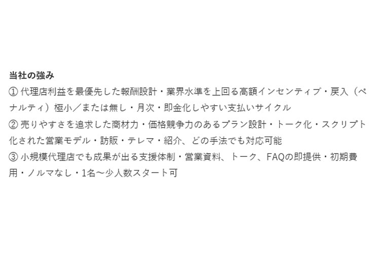 | 特長 | 初期費用・在庫・ノルマなし、営業自由度が高く、回線・電力の継続契約で安定収益を実現できる、低リスクな代理店ビジネスです |