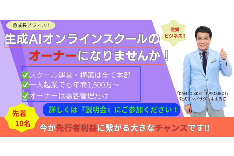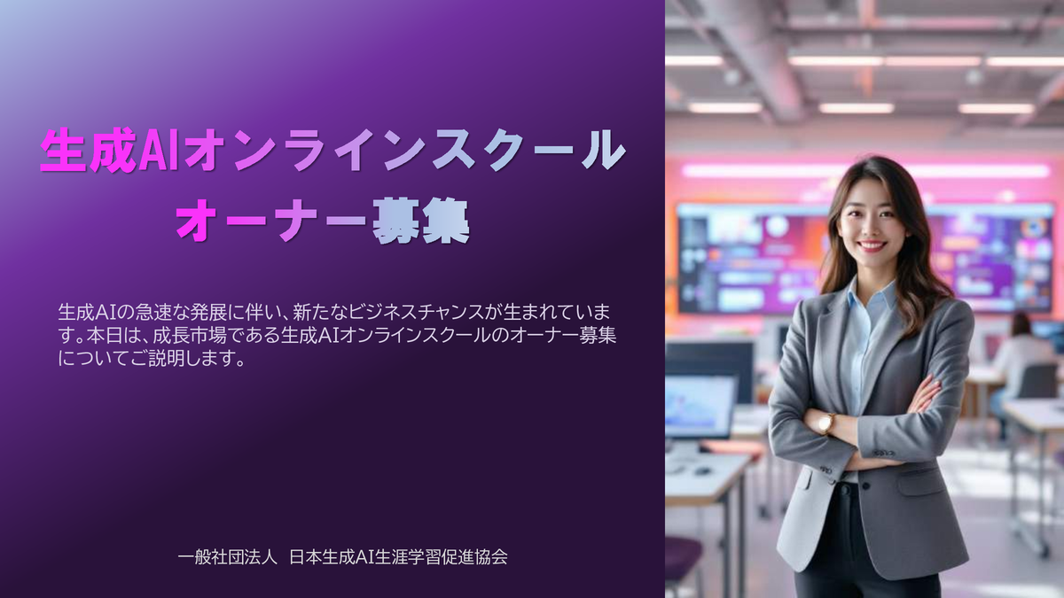 生成AI, 教育ビジネス, AI, スキルアップ, 法人契約, AI活用, スクールオーナー, オンラインスクール, 補助金活用, 顧客管理, ChatGPT活用, 起業支援, 運営代行, 副業, 経営コンサル, AIスクール, 低リスク, ChatGPT, AIビジネス, 未経験, マーケティング支援, 集客サポート, フランチャイズ, 動画講座, 高収益