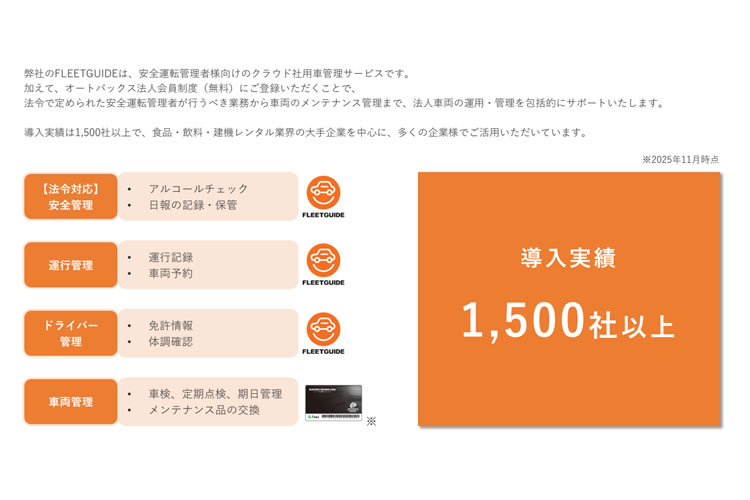 自動車関連業種との相性が高く、既存顧客への追加提案も行いやすいほか、オートバックス法人制度との連携により点検・整備との一括提案も可能。