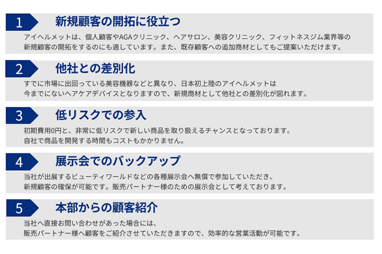 美容サロン導入, 美容健康機器, LLLT, 営業支援, 資料提供, AGA対策, ヘアケア, FDA認証, 美容機器, ISO13485, 日本初上陸, CE認証, 薄毛対策, ヘルスケア機器, スカルプケア, アイヘルメット, CFDA認証, 頭皮ケア, 低出力レーザー, 美容展示会, 販促ツール, 男女兼用, 販売パートナー, ビューティワールド, 初期研修, ホームケア, 販路拡大, 医療機器レベルあなたにオススメの商材(販路が同じ)