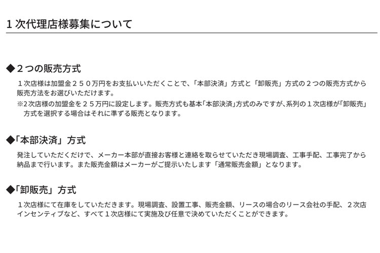 | 1 次代理店様募集について | ■「本部決済」方式 発注していただくだけで、メーカー本部が直接お客様と連絡を取らせていただき現場調査、工事手配、工事完了から 納品まで行います。また販売金額はメーカーがご提示いたします「通常販売金額」となります。 ■「卸販売」方式 1次店様にて在庫をしていただきます。現場調査、設置工事、販売金額、リースの場合のリース会社の手配、2次店 インセンティブなど、すべて1次店様にて実施及び任意で決めていただくことができます。 |