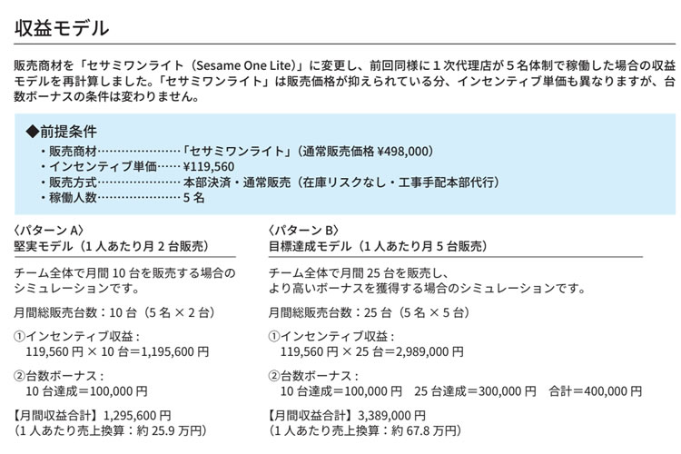 営業経験がない方でも、サポートを活用しながら1件の契約を取ることができれば、その成果は非常に大きなものになります。また、月間の販売台数に応じたボーナス制度も用意されており、継続的に取り組むことで安定した収益を得られる仕組みになっています。