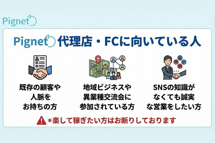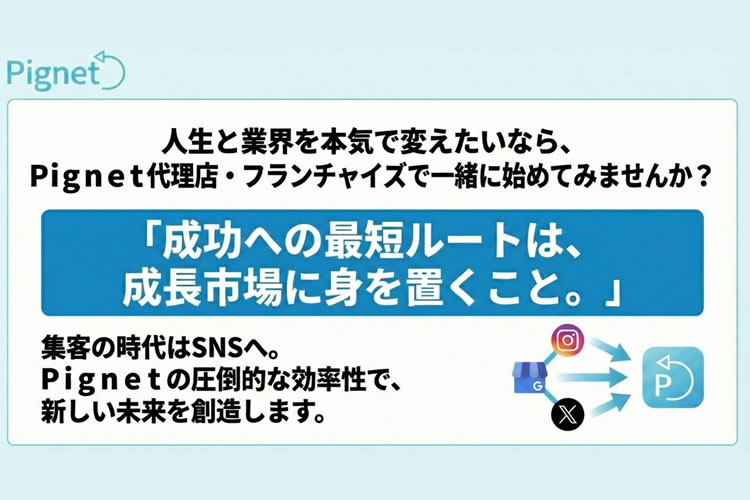 AIを使った次世代のSNS自動投稿サービス「Pignet」は経済産業省AOTAKEプロジェクト採択事業です。Pignetの販売を通してSNS業界の変革を目指す販売代理店を募集!私たちは「深い信頼関係を築くこと」を大切にしています。 地域の店舗や企業へ直接足を運び、仕事に100%集中できる環境と覚悟をお持ちの方こそが、このビジネスで真の成功を収めることができます。「深い信頼関係を築く」為には契約後のフォローも代理店様の大切な役割だと考えています。本部が提供する営業資料やトークスクリプト、充実した研修制度を活用し、ストック収益を確保しましょう!