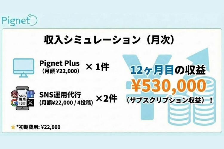 •Pignetの「販売報酬」に加え、高利益な「SNS運用代行」で、ダブルインカムモデルを、構築する最大の好機です。