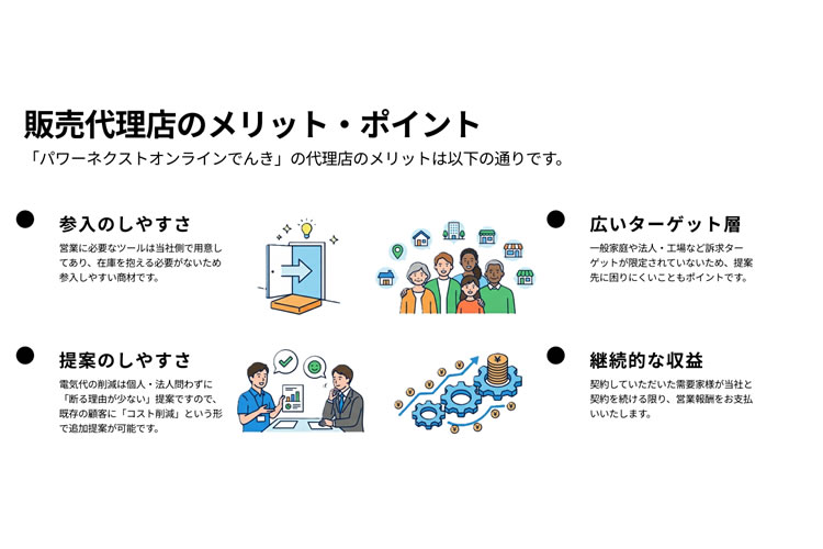 「パワーネクストオンラインでんき」は、電気料金の見直しを通じてコスト削減を提案できる、法人・店舗・工場向けの扱いやすい商材です。近年の電気料金高騰により固定費削減ニーズが高まる中、電気代削減は断られにくく、既存顧客への追加提案にもつなげやすい点が強みです。