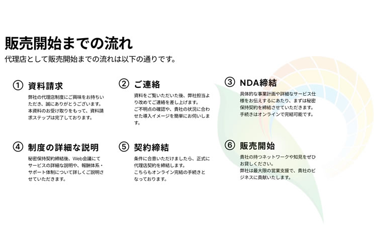 さらに、商談の難易度が高い場合には、本部担当者がオンラインで同席するサポート体制も用意しています。経験が少ない方でも安心して営業活動を行うことができます。