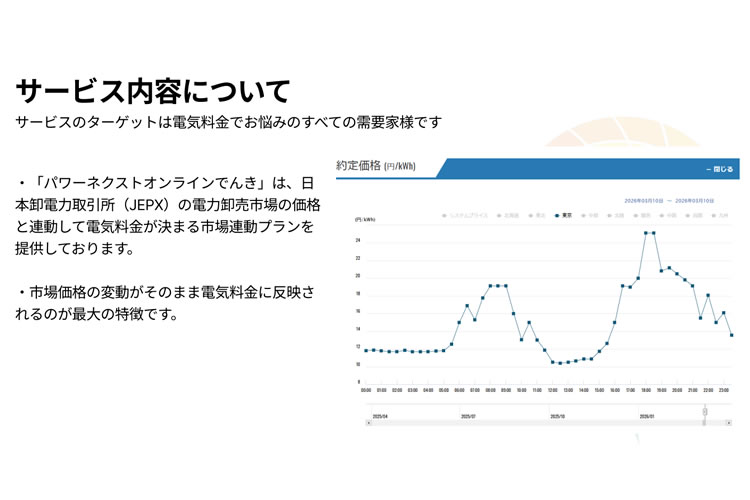 また、市場連動型の料金プランにより、透明性の高い電気料金が提示できる点も特徴です。料金の仕組みが明確であることは、信頼性の高い提案につながります。