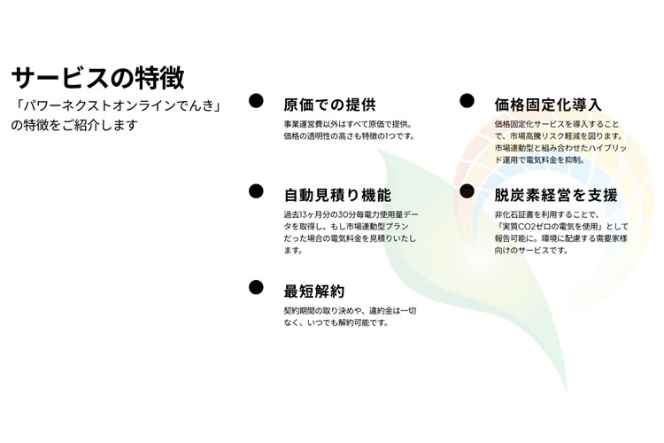 「パワーネクストオンラインでんき」は、電気料金の見直しによるコスト削減を提案できるサービスであり、法人・店舗・工場など幅広い需要家に対して提案しやすい点が特徴です。電気代削減は個人・法人問わず「断る理由が少ない」提案であり、既存顧客への追加提案にも適しています。