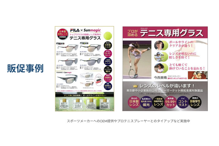 | お取り扱い商品 | アスリート専用サングラス(テニス・ゴルフ対応)/ 偏光レンズ / 試着用見本品 / コレクションBOX / 販促支援ツール / 商品研修プログラム |