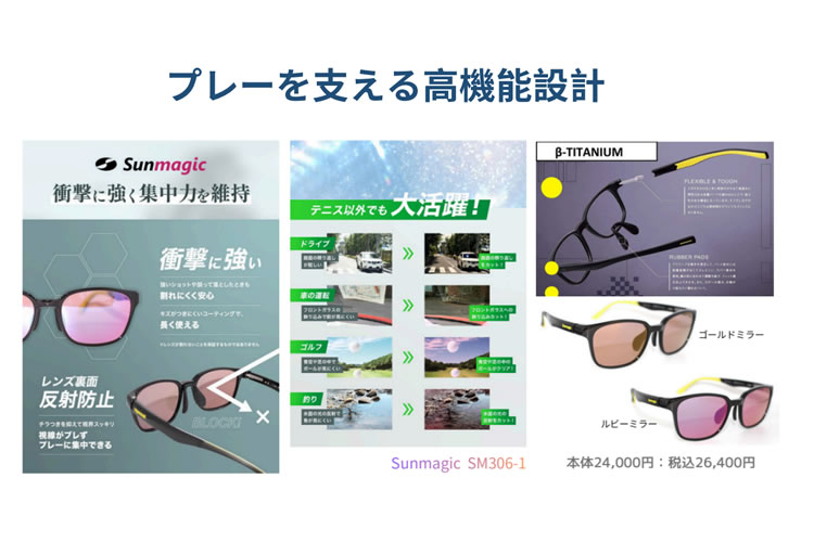 現在、Sunmagicはテニス・ゴルフを中心にプロ・アマ問わず競技者に広まっていますが、スポーツアイウェアのニーズは野球・サイクリング・マリンスポーツなど多岐に渡ります。4モデル・複数カラー展開により、さまざまなスポーツシーンへの提案が可能です。