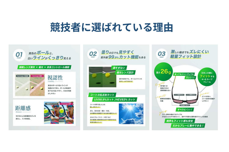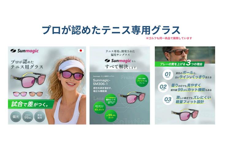 Sunmagicの最大の武器は、「かけた瞬間に違いが分かる」という商品体験そのものです。紫外線99.9%カット・波長コントロール機能の偏光レンズにより、ボールやコートラインの視認性が劇的に向上。テニスやゴルフを楽しむ人なら、試着した瞬間に価値を体感できます。