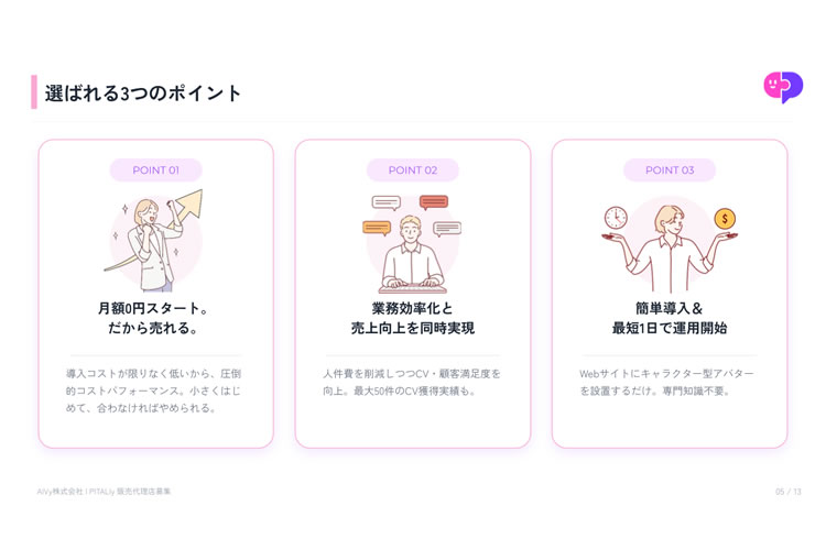 「PITALIy」(ピタリー)は、月額0円からスタートできるAI接客アバターサービスのため、導入ハードルが非常に低い点が特徴です。「まず月額0円で試してください」という提案からスタートできる営業フローで、商談化率の向上につながる仕組みとなっています。
