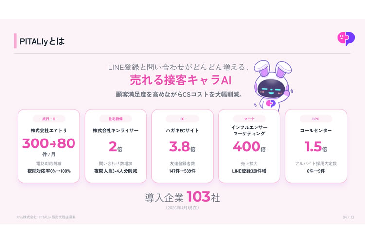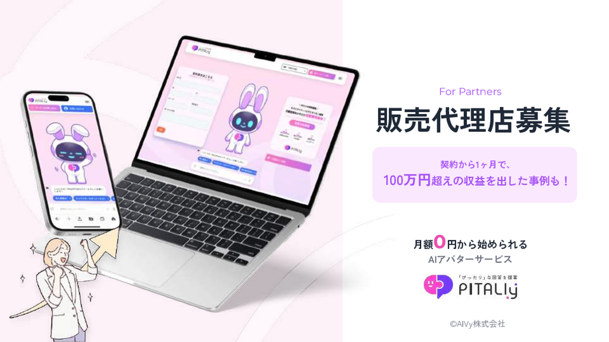 業界初|1ヶ月100万円超の収益事例が出た無料から売れる“AI代理店”初解禁! 「AI接客アバター PITALIy」販売代理店募集