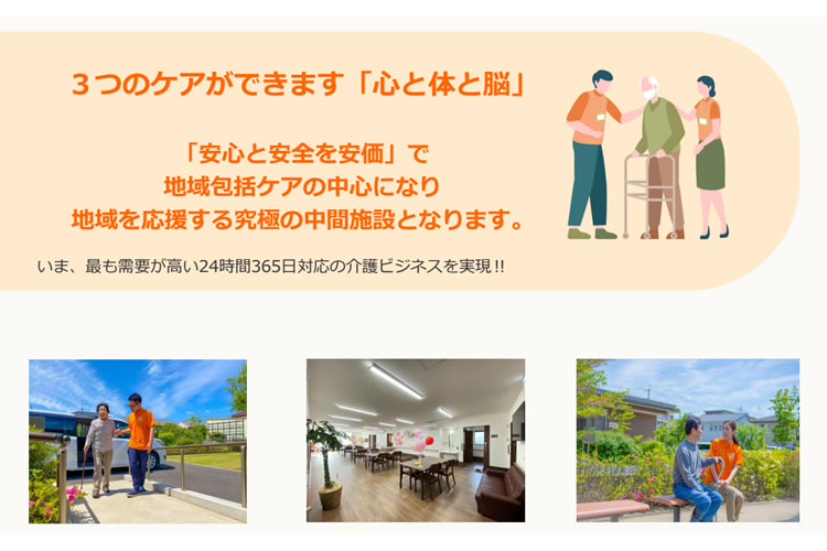 | 特長 | 通所・宿泊・居住を組み合わせた併設モデルにより収益源を分散し、安定経営と早期黒字化を実現。未経験でも本部支援で安心して始められる介護ビジネス。 |