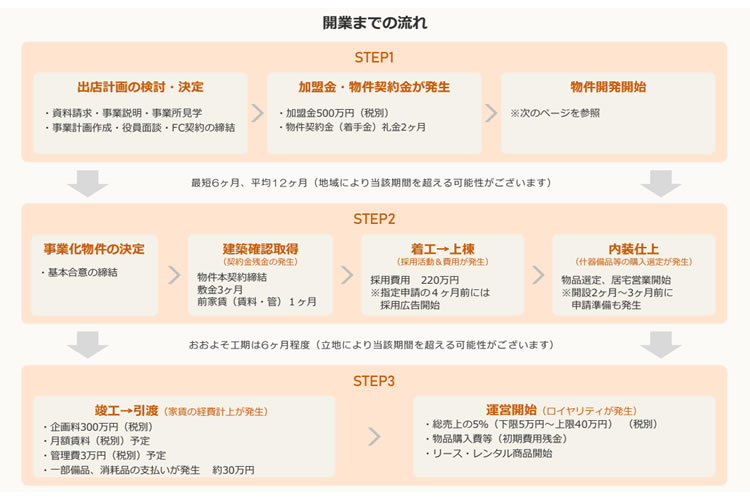 本サービスでは、開業準備から運営まで本部がしっかりとサポートする体制が整っています。物件選定や市場調査、資金計画、採用支援、研修など、事業立ち上げに必要な工程をトータルで支援します。
