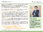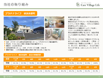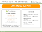 | 事業内容 | ・住宅型有料老人ホーム+お泊りデイサービス 「ケアヴィレッジライフ」事業 ・新築・全個室/24時間365日夜間対応型デイサービス 「ブルーミングケア」事業 ・地域密着型デイサービス「ぺルメールケア」事業 ・地域密着型デイサービス(自立支援特化型)「ケアフィットルーム」事業 ・介護・福祉コンサルティング事業 |