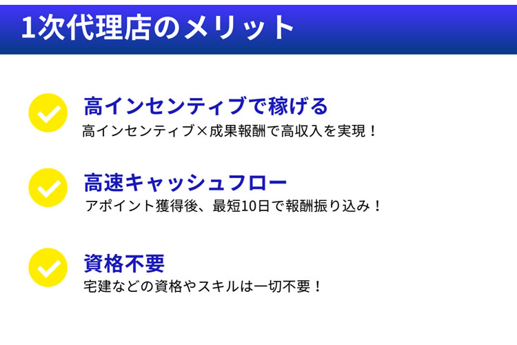 | 収益 | 1件の成約で100万円以上の高報酬 |