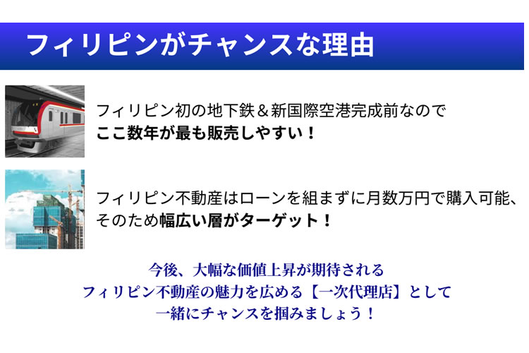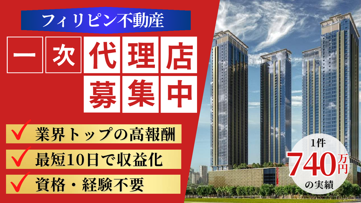 オンライン営業, 海外投資代理店, ストック型収益, 営業代理店, 収益ビジネス, 資産運用, 販売代理店, 独立ビジネス, 不動産紹介, 不動産代理店, 海外不動産, 一次代理店, フィリピン不動産, 海外投資, 高収益ビジネス, 個人代理店, 法人代理店, 代理店募集, 営業商材, 東南アジア不動産, 高単価商材, 副業代理店, 高額報酬, 富裕層営業, ブルーオーシャン市場, 投資用不動産, 不動産投資, 高報酬, 不動産販売, 不動産ビジネスあなたにオススメの商材(販路が同じ)
