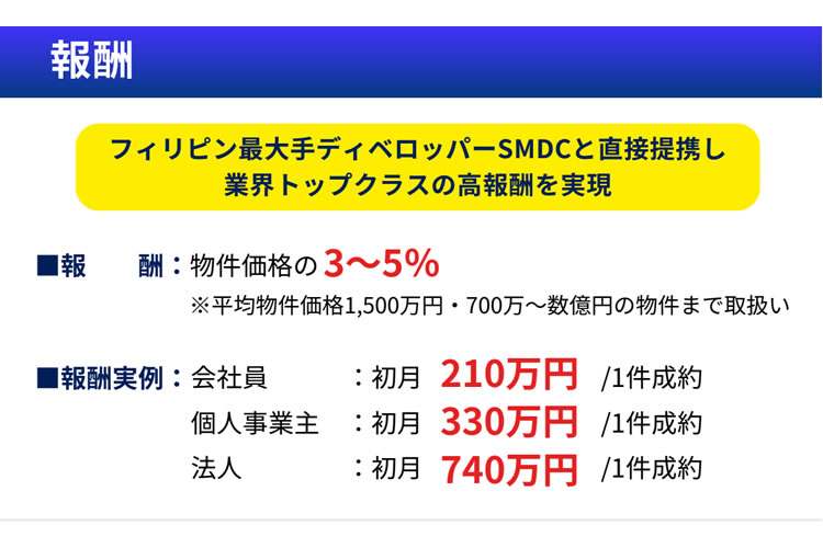 本ビジネスの最大の魅力は、物件価格に対して最大5%の報酬が設定されている点です。フィリピンの平均物件価格は約1,500万円とされており、1件成約でも数十万円から数百万円規模の報酬が期待できます。また、700万円〜数億円の物件まで取り扱いがあるため、成約金額に応じて報酬も大きくなります。