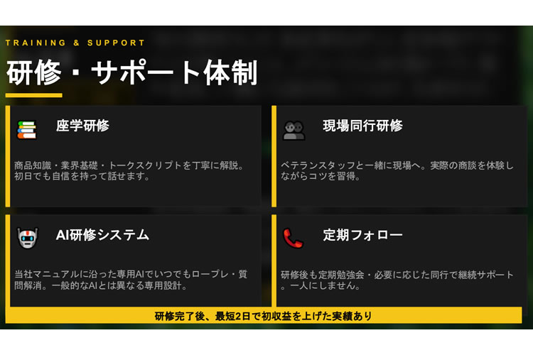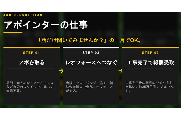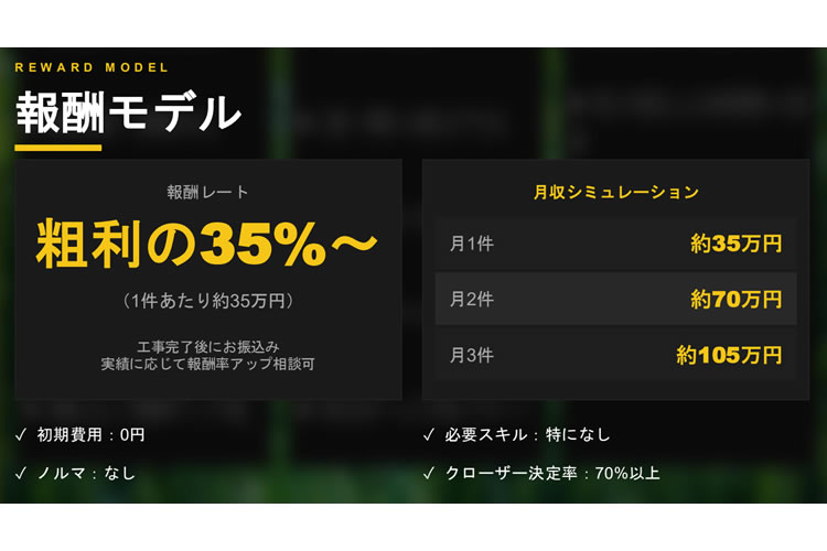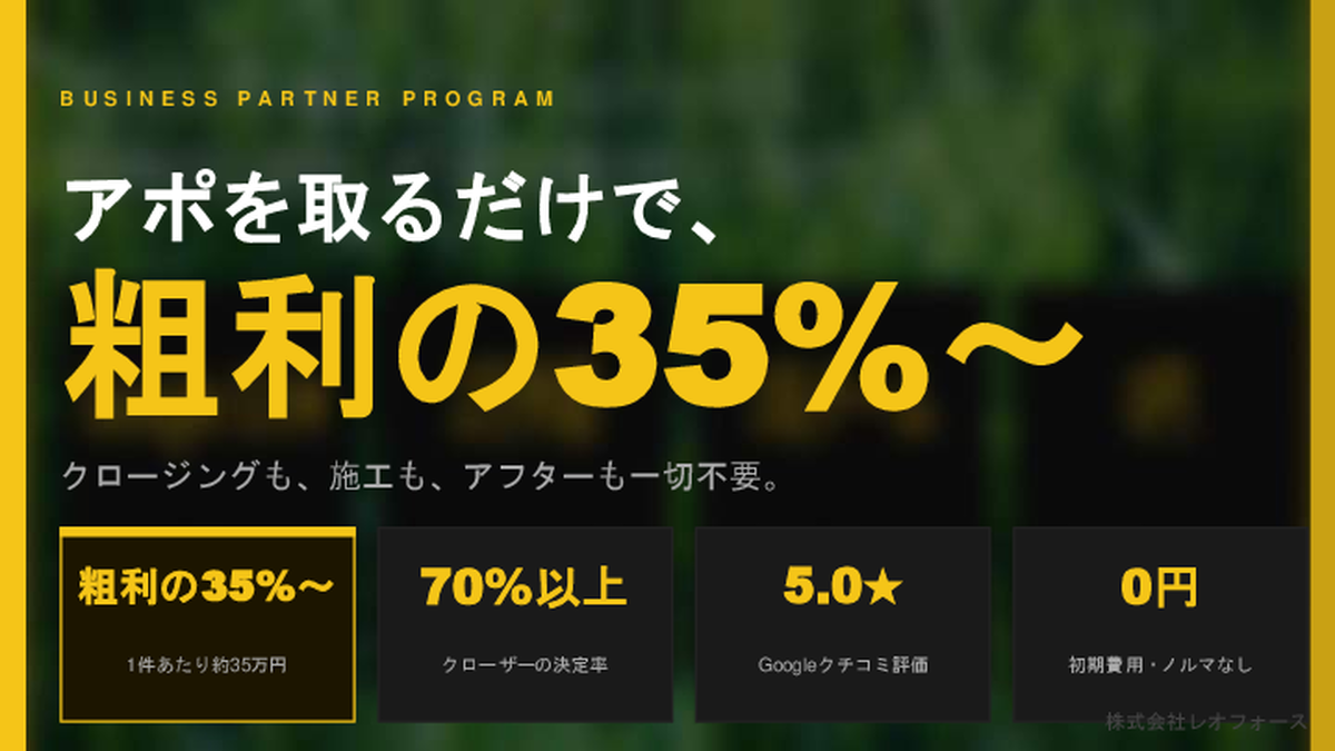 | 特長 | 提案や契約は本部対応、高決定率体制により専門知識なしでも再現性高く収益化を目指せます。 |
