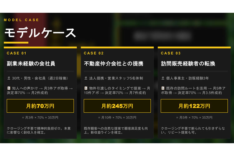 | モデルケース | ■副業未経験の会社員 30代・男性・会社員(週 2日稼働) 月収:約70万円 ■不動 産仲 介会社 との 提携 法人提携・営業スタッフ5名体制 月収:約245万円 ■訪問販売経験者の転換 個人事業主・訪販経験3年 月収:約122万円 |