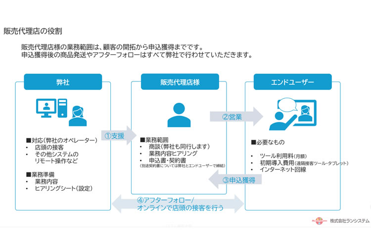 「遠隔接客BPOサービス」の代理店制度は、見込み顧客の開拓から申込獲得までを担当し、契約後の運用や接客対応はすべて弊社が対応する手離れの良いビジネスモデルです。