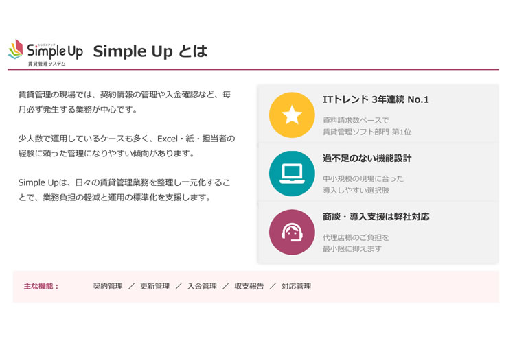 機能は契約管理・入金管理・更新管理など、現場で本当に必要なものに絞られており、過不足のないシンプルな設計となっています。そのため、ITに詳しくない方でも使いやすく、スムーズに導入できるのが特徴です。