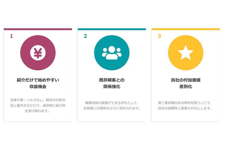 | メリット | ・紹介だけで始めやすい収益機会 ・既存顧客との関係強化 ・自社の付加価値の差別化 |