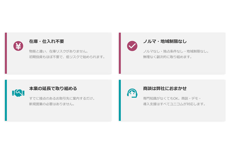 | 特長 | 紹介のみで収益化できるシンプルな仕組みと、低リスク・低負担な運用が特徴。DX商材による課題解決提案が可能で、既存顧客との関係強化と安定した副収入の両立を実現できる。 |