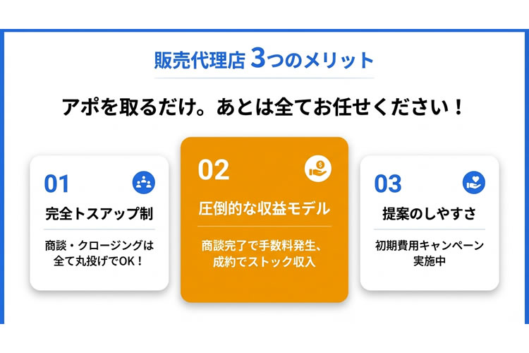 本代理店モデルの最大の特徴は、「アポイントの獲得」に特化できる点です。商談やクロージングはすべて弊社が対応する完全トスアップ型の仕組みとなっています。