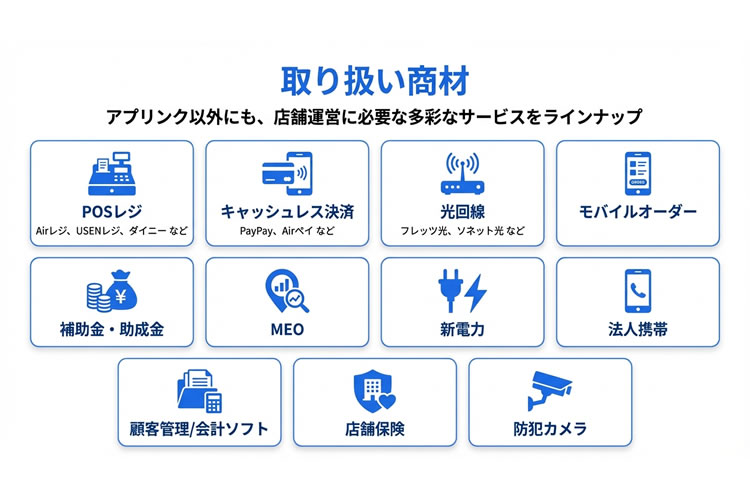 | 商材一覧 | ・POSレジ ・キャッシュレス ・インターネット回線 ・モバイルオーダー ・タブレットオーダー ・新電力 ・太陽光パネル/エコキュート ・MEO ・法人携帯 ・公的補助金/助成金 ・その他DX関連サービス |