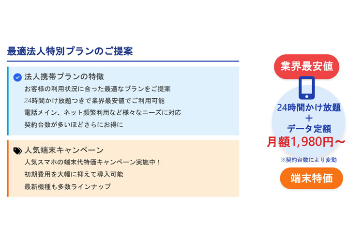 提供する法人携帯は、3大キャリア対応の特別プランで、月額1,980円~という業界最安水準を実現。通話し放題・データ定額といった機能も標準搭載されており、経営層への提案時に高い関心を引きやすい点も魅力です。