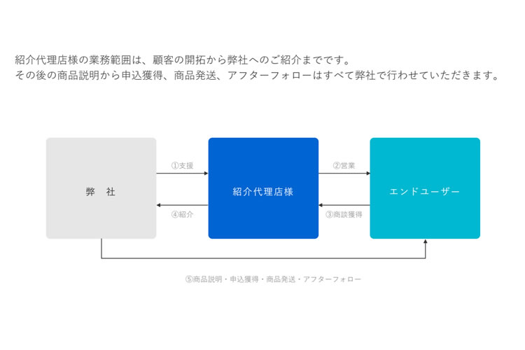 | 収益 | 見込み客を紹介いただき、弊社にて成約した場合に手数料としてお支払い |