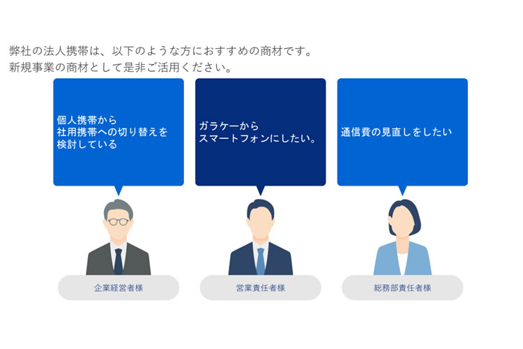 また、使用頻度や業務内容に応じて複数のプランから柔軟に最適化できるため、営業先企業の業種・規模を問わず幅広い提案が可能です。例えば、電話中心の業務が多い営業会社にはかけ放題を、データ通信量が多い現場作業員には大容量プランを推奨するなど、的確なアプローチが取れます。