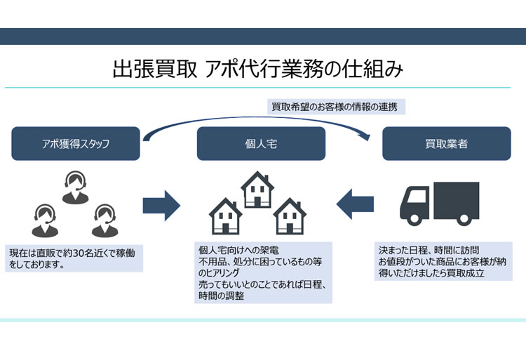 「出張買取アポ代行」は、完全リモートで始められる法人向けビジネスで、個人宅に電話をかけ、買取訪問のアポイントを取得する業務です。買取や訪問は提携の古物商が行うため、導入企業は電話対応のみで完結。