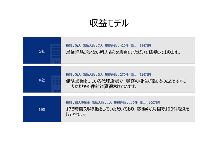 | 収益モデル | ■法人 活動人数:7人 獲得件数:420件 売上:336万円 ■法人 活動人数:3人 獲得件数:270件 売上:216万円 ■個人事業主 活動人数:1人 獲得件数:110件 売上:100万円 |
