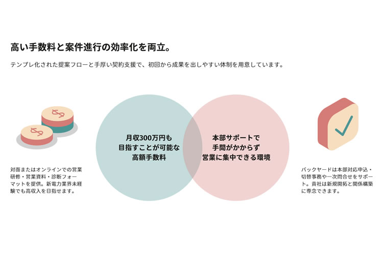 営業はお客様との信頼構築と提案に集中でき、高報酬の成果報酬型ビジネスとして効率的に収益化が可能です。