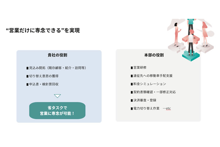営業活動に専念できる仕組みが整った本パートナー制度では、契約書類や電力切替手続き、決済審査などの煩雑な業務を本部が一括対応。
