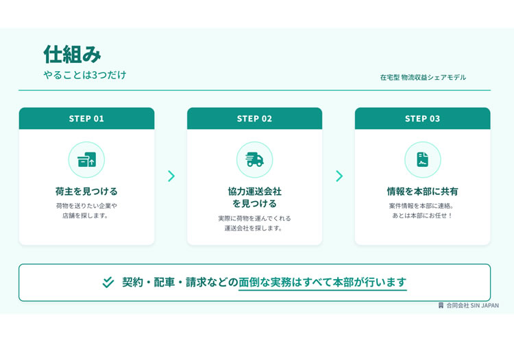 当ビジネスでやることは大きく3つございます。荷物を送りたい企業(荷主)を見つけること。実際に運んでくれる協力運送会社を見つけること。そして、その情報を本部へ共有すること。この流れだけです。